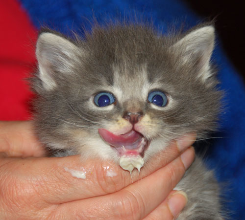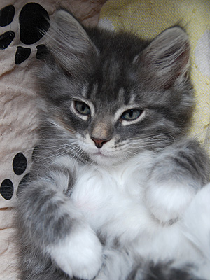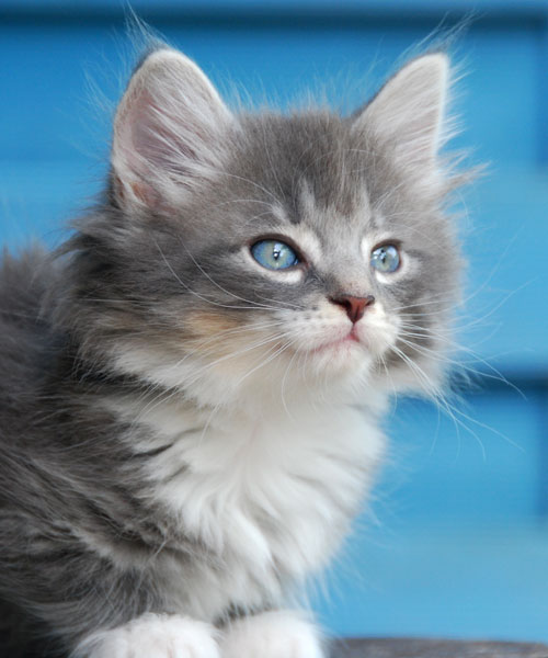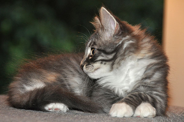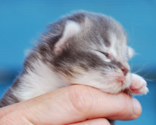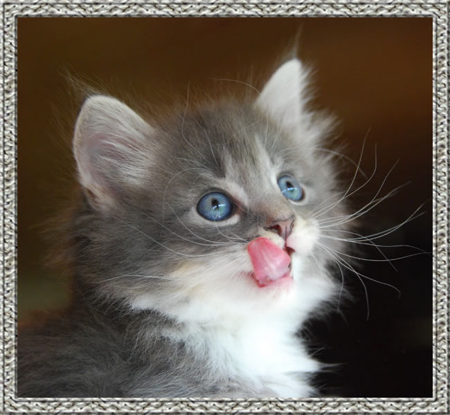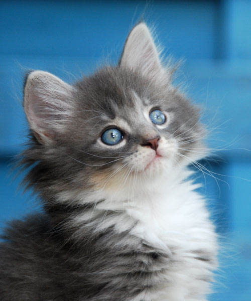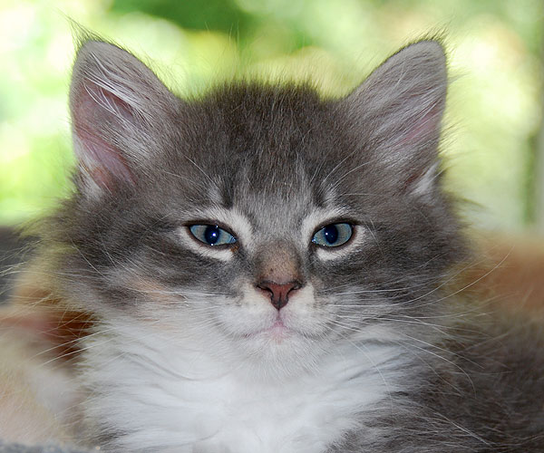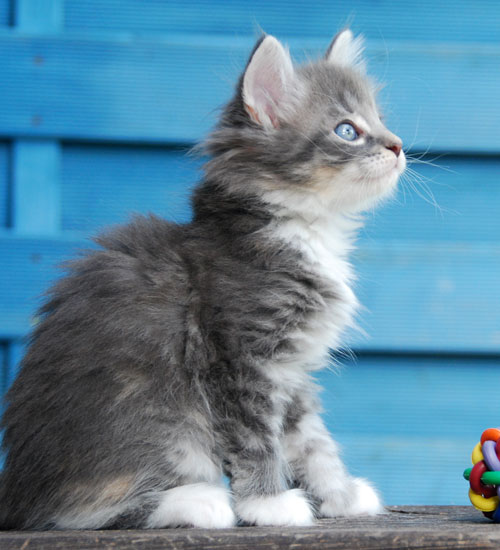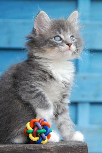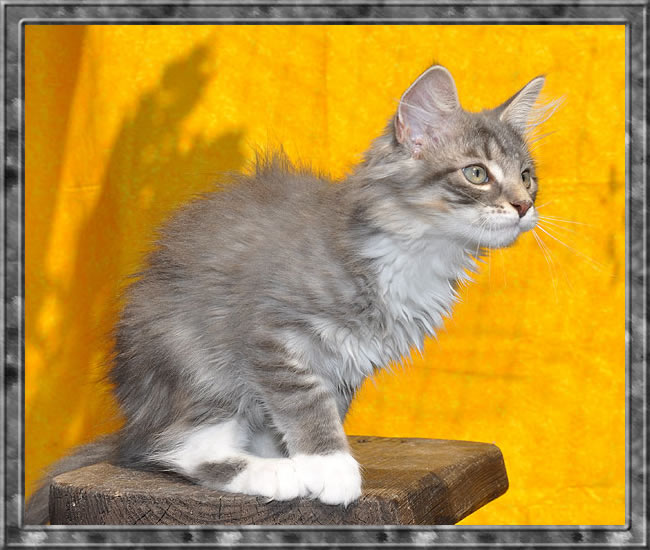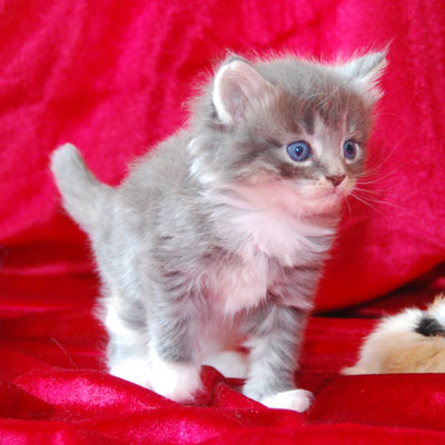 Ihre Creme-Flecken, die etwas Entwicklungszeit brauchen, werden immer größer. Besonders die cremefarbenen Nackensträhnen geben dem blauen Haarkleid eine schöne Duftigkeit. Langsam entwickelt sich auch ihr Silber und lässt das Fell bei Lichteinfall von innen heraus aufleuchten.