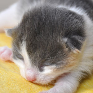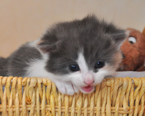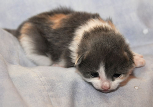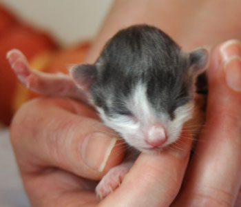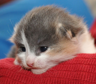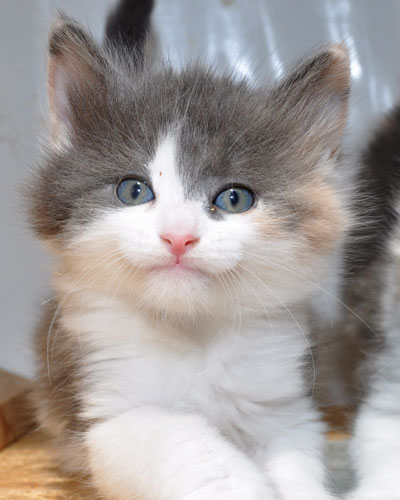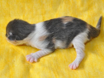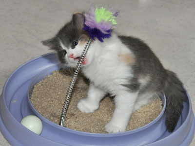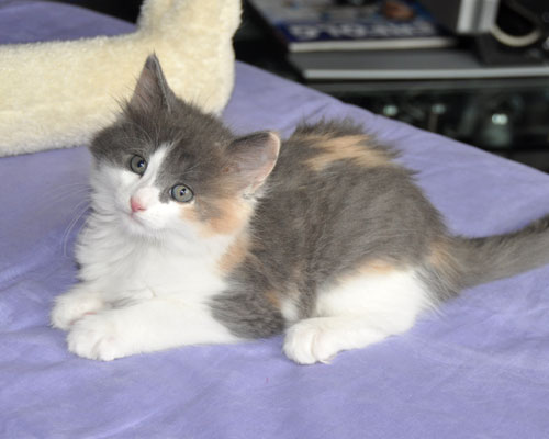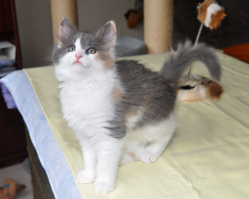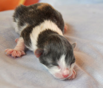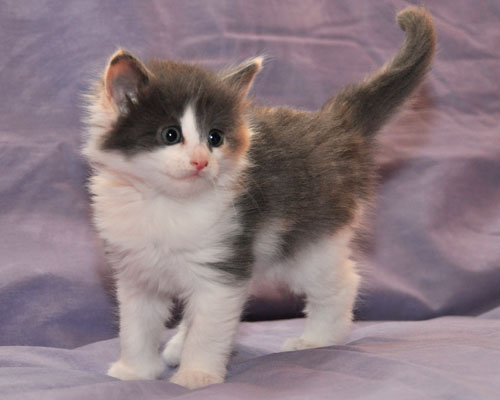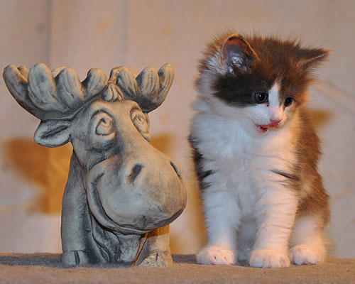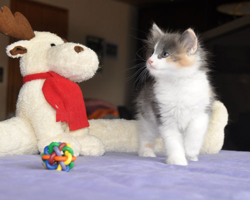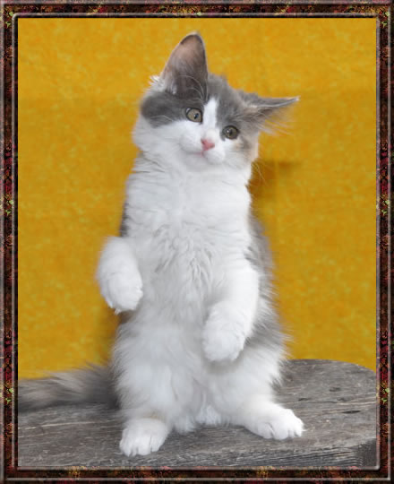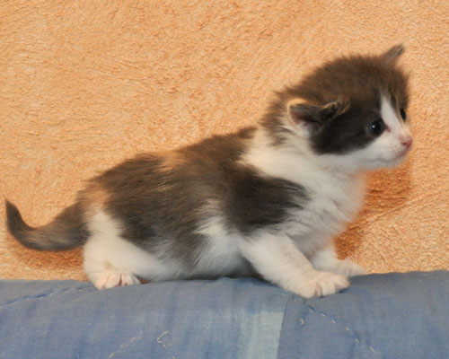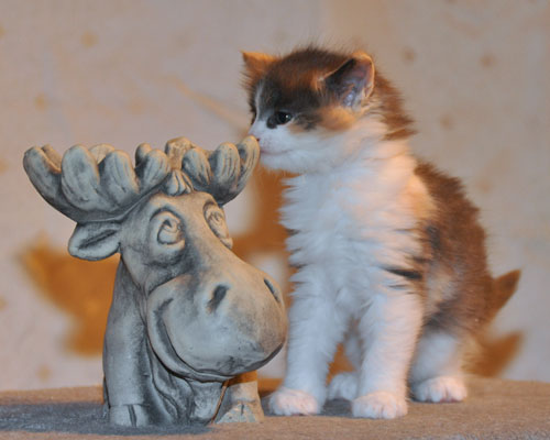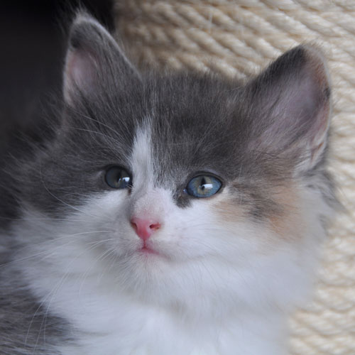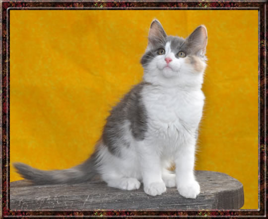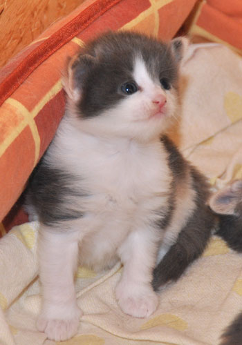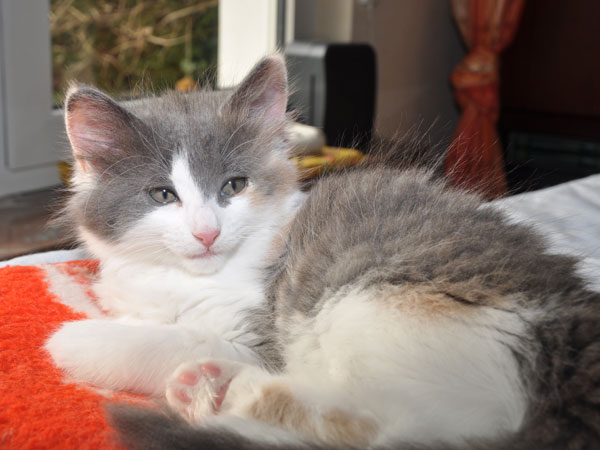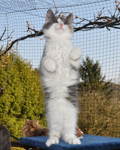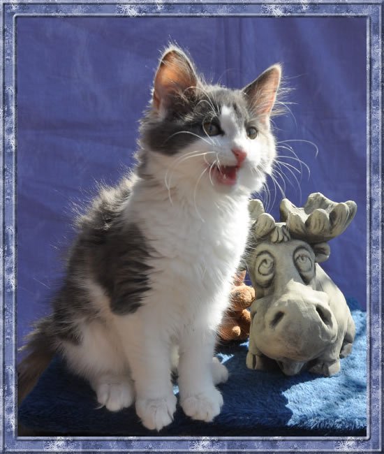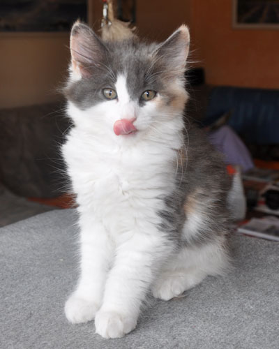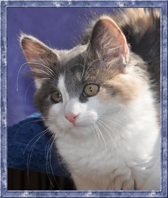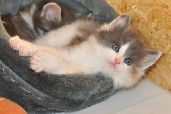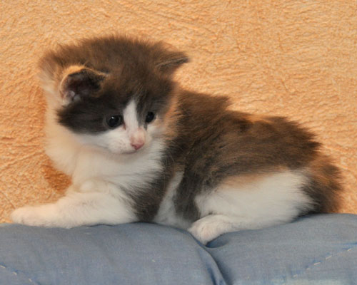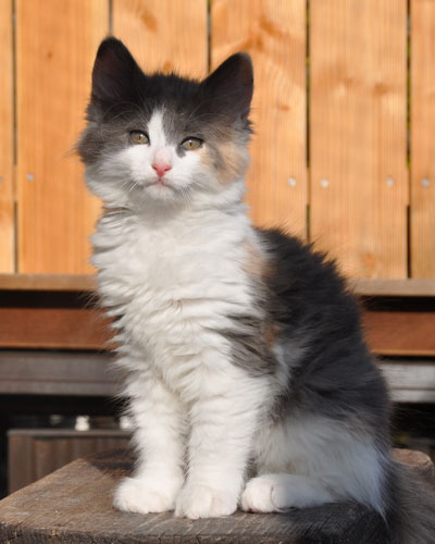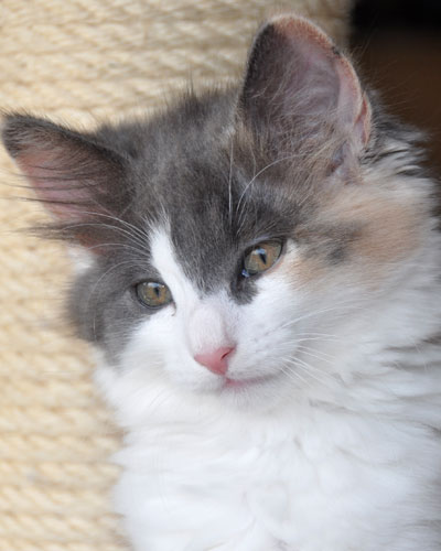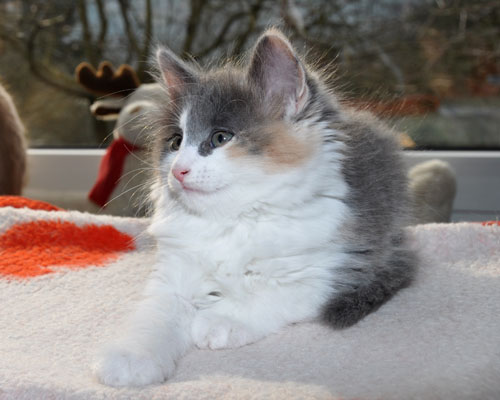 Dajana unterstreicht ihre extravagante Optik durch die frech zur Seite gekämmte weiße Haarsträhne. Der umlaufende reinweiße Schal wird ihr einmal eine besonders prächtige Halskrause verleihen.