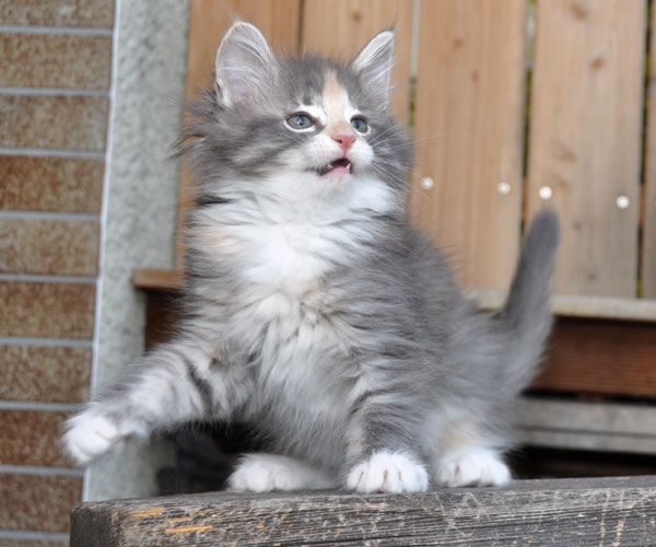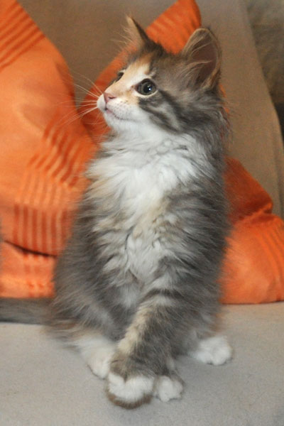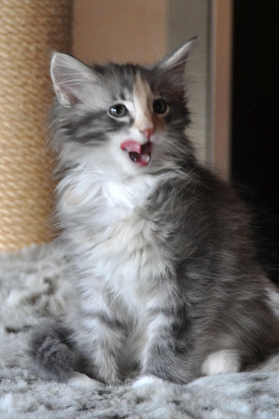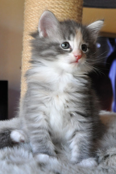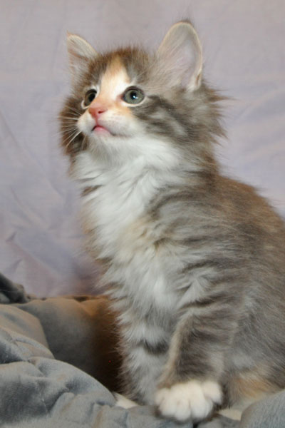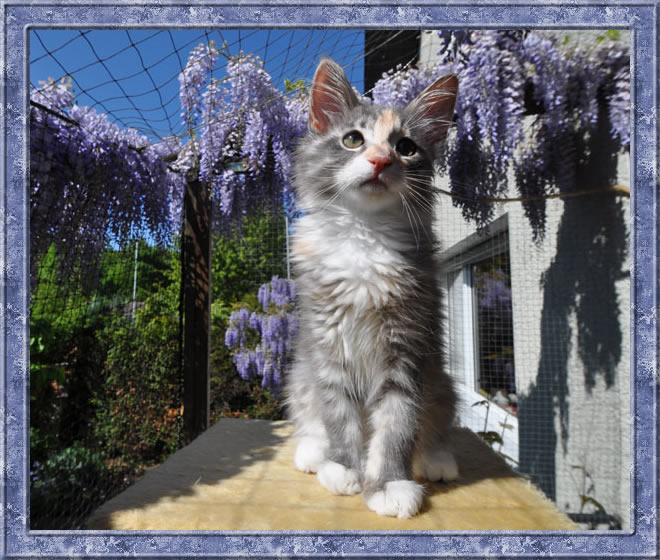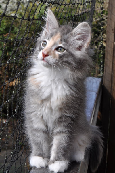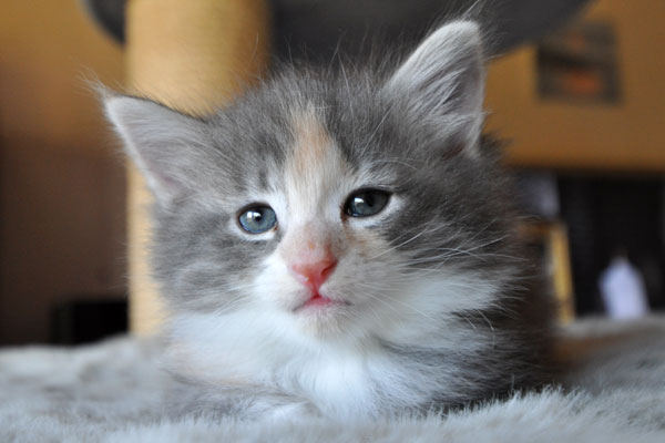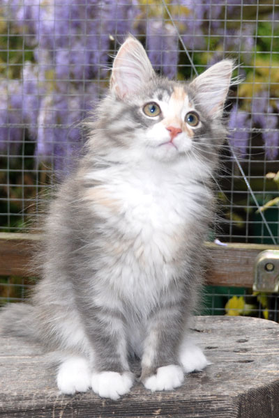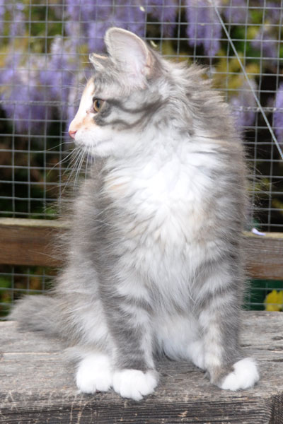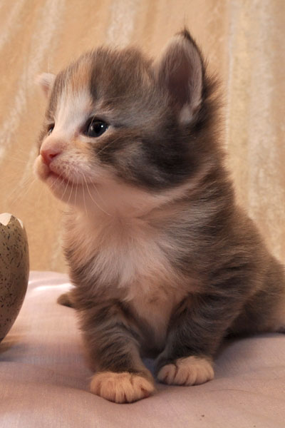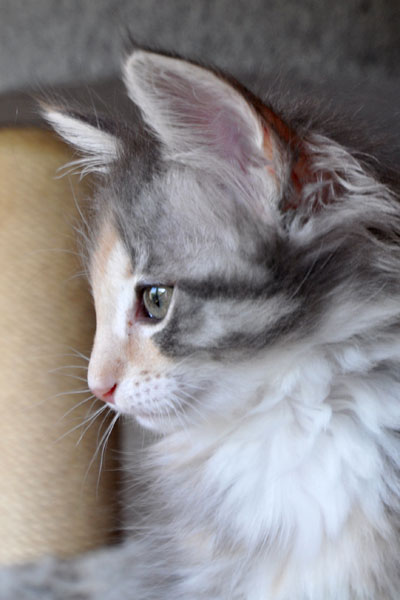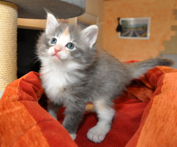 Gipsy ist unsere 3-farbige Glückskatze in diesem Wurf. Eine klassische Weiß-Verteilung wird von der creme-farbenen Stirnflamme gekrönt. Und damits nicht zu langweilig wird, gibt es locker verteilt noch einige weitere Creme-Tupfer. Das Ganze wird gekrönt durch ein kräftiges Silber. Die Fotos der ersten Wochen lassen kaum erahnen, dass sie einmal ein sehr helles Kleidchen tragen wird.