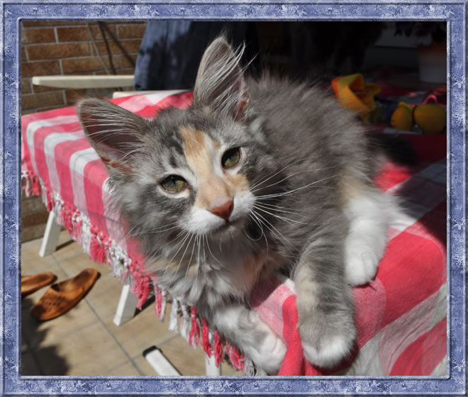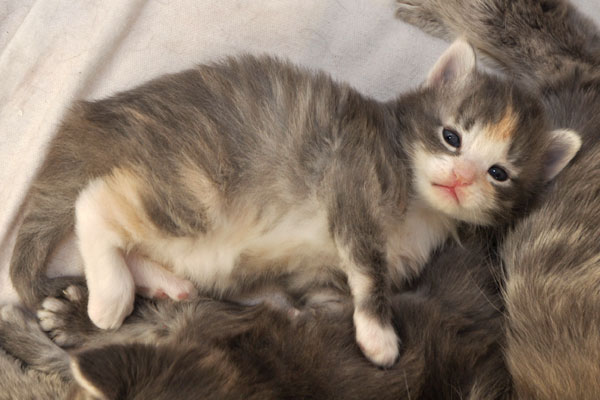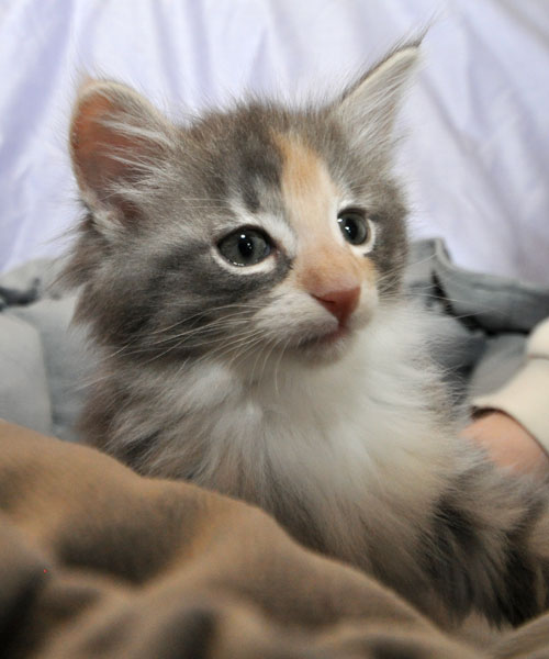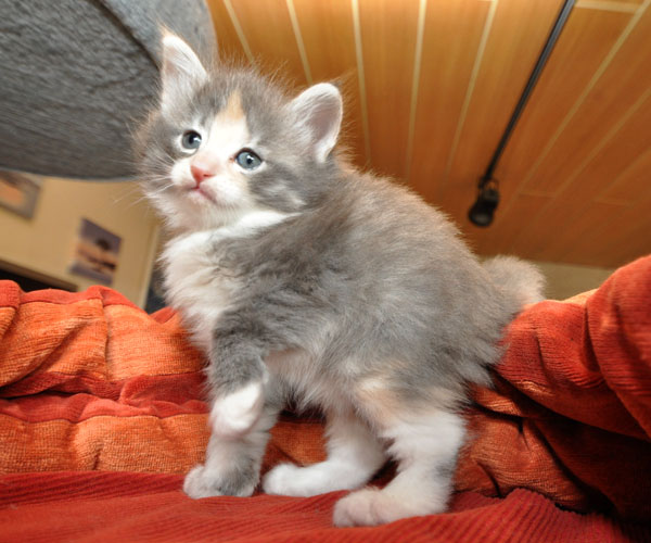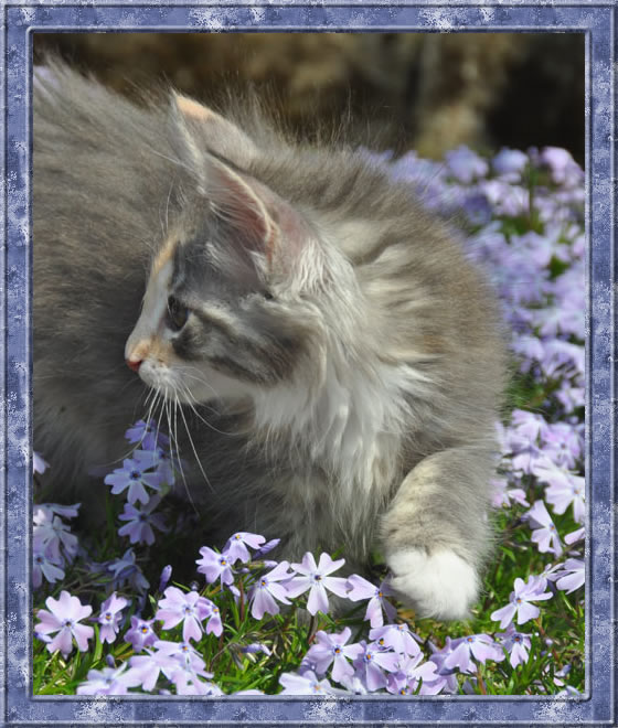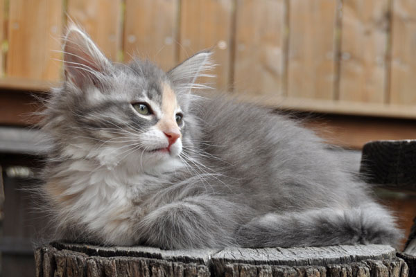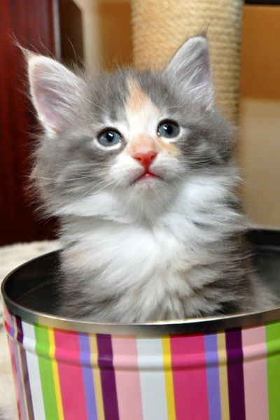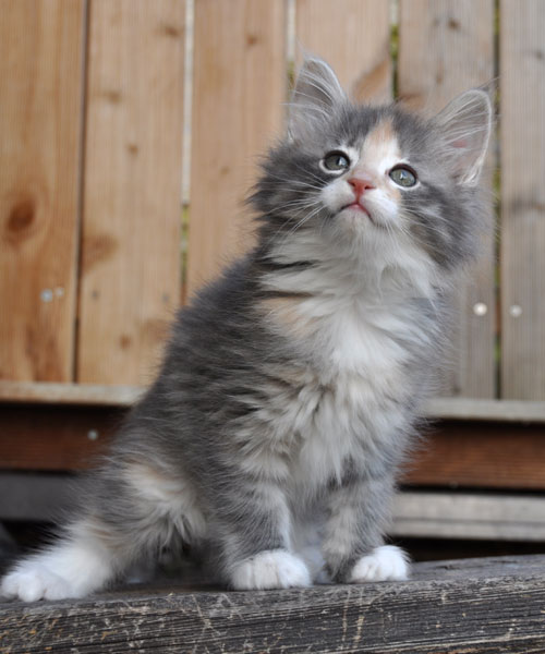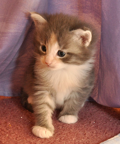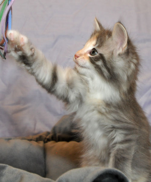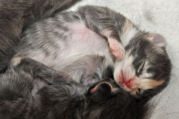 Gipsy ist unsere 3-farbige Glückskatze in diesem Wurf. Eine klassische Weiß-Verteilung wird von der creme-farbenen Stirnflamme gekrönt. Und damits nicht zu langweilig wird, gibt es locker verteilt noch einige weitere Creme-Tupfer. Das Ganze wird gekrönt durch ein kräftiges Silber. Die Fotos der ersten Wochen lassen kaum erahnen, dass sie einmal ein sehr helles Kleidchen tragen wird.