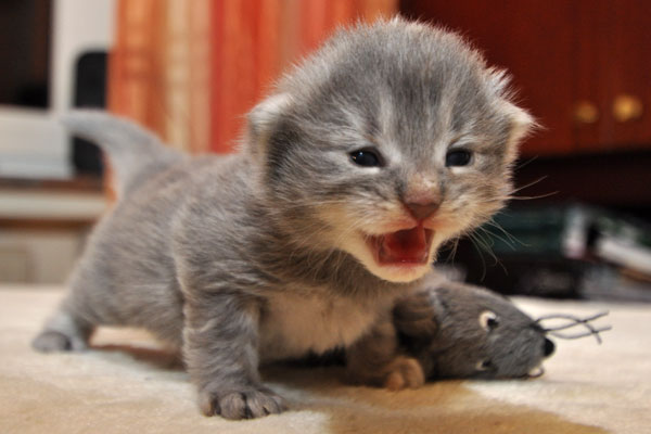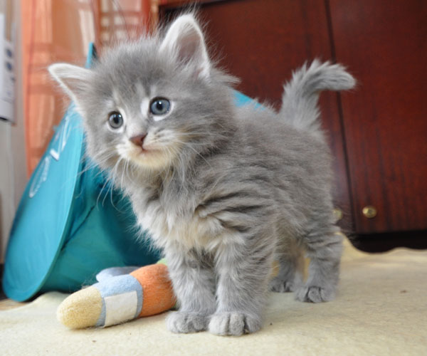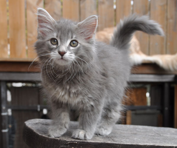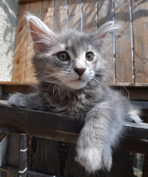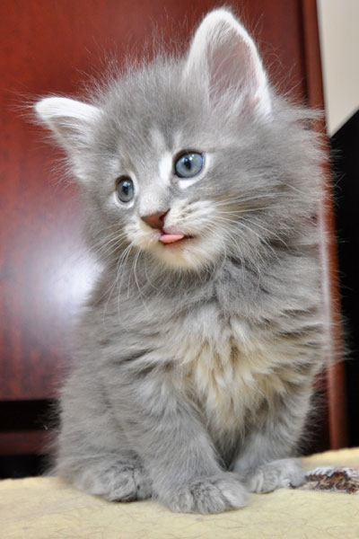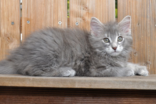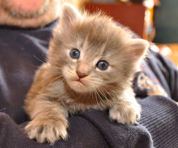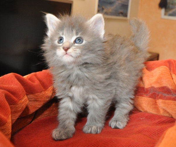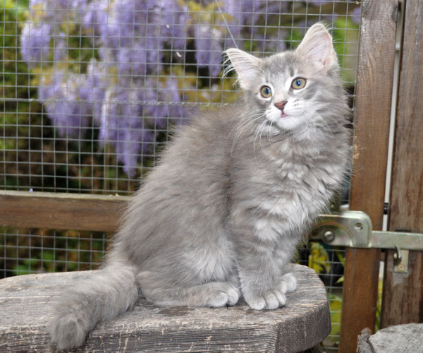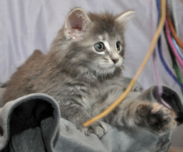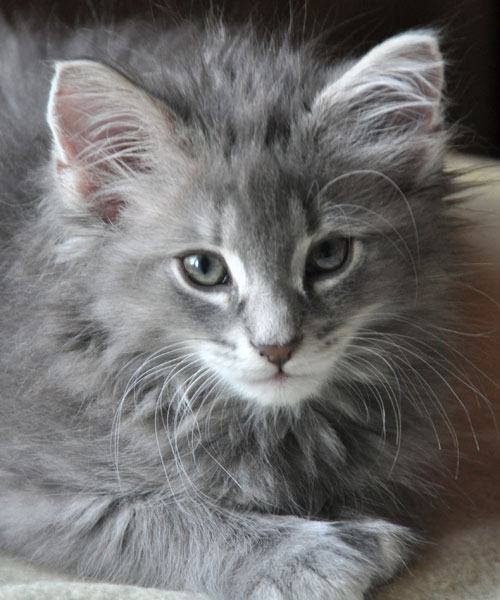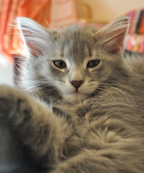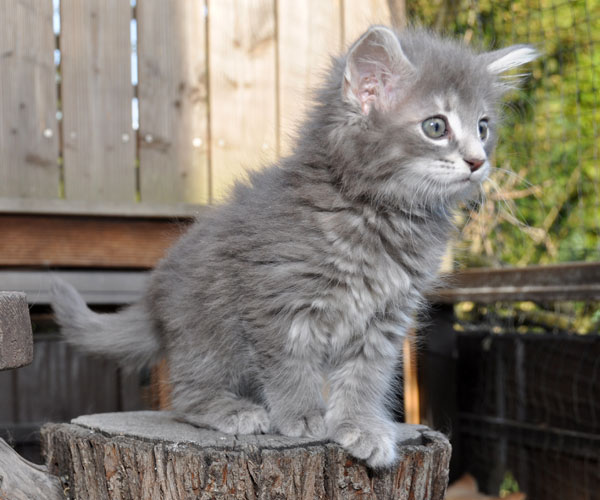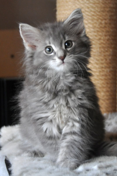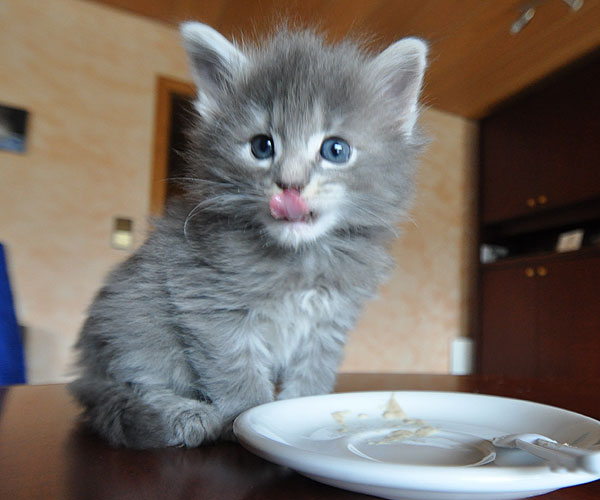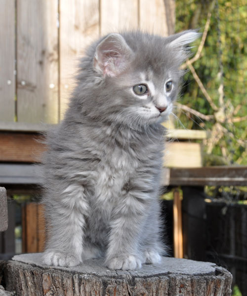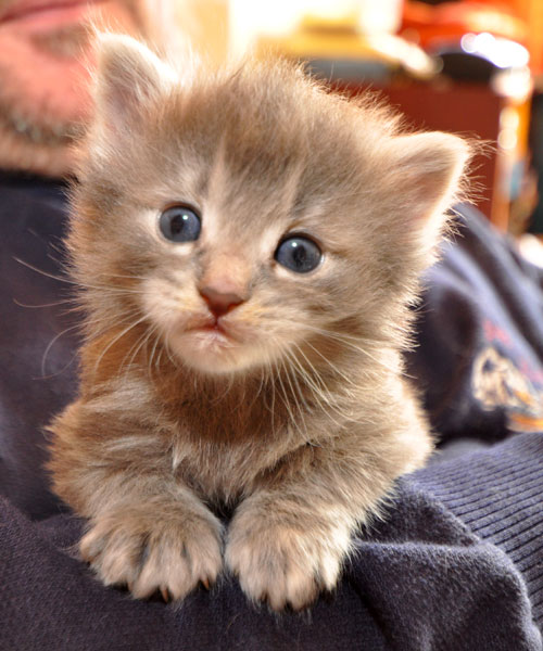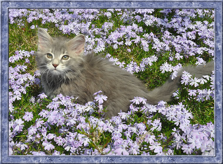 Greta hat den Model-Instinkt. Egal wie man sie fotografiert, sie sieht immer anmutig aus. Gesichtsausdruck und Körpersprache erinnern uns sehr an ihre Mutter Avinia im Kittenalter. Schließlich war das ja auch der Grund, warum Avinia damals bei uns blieb und uns mit ihrem Blick heute noch weich werden läßt. Im Moment wird Greta's blaues Kleidchen nur von wenigen kleinen Creme-Tupfern unterbrochen. Es ist aber zu vermuten, dass sich ihr Creme-Anteil ähnlich wie bei ihrer Mutter entwickeln wird.