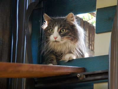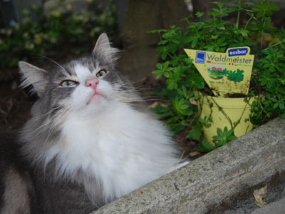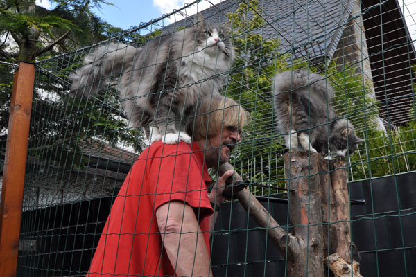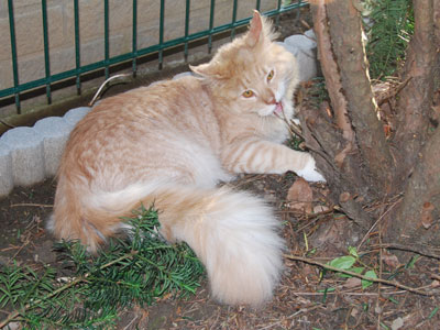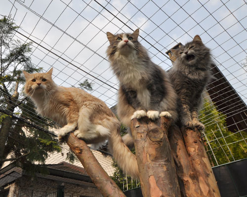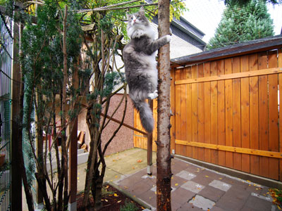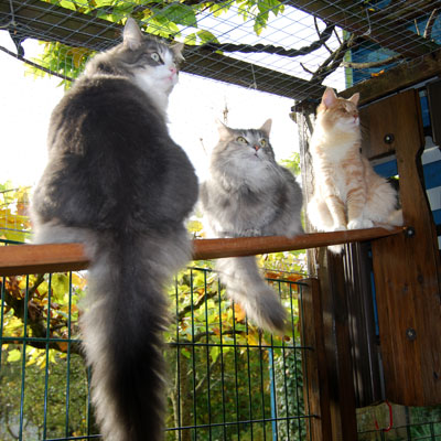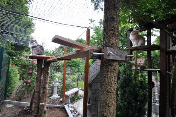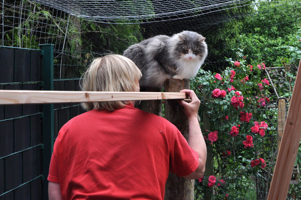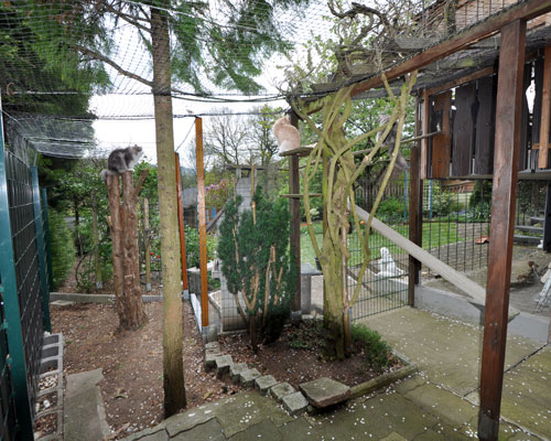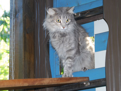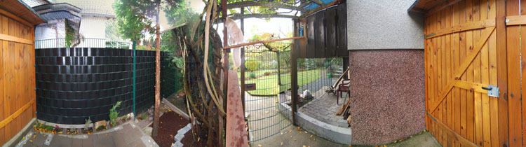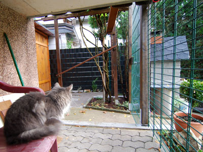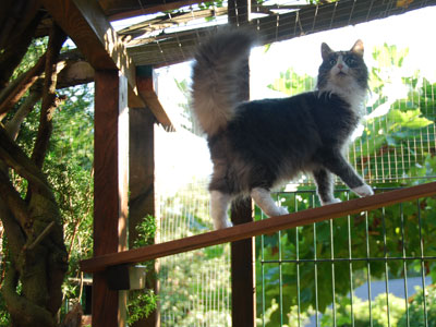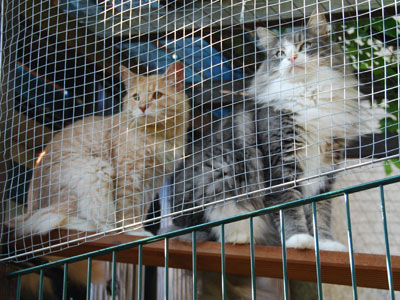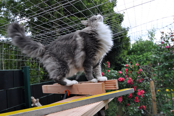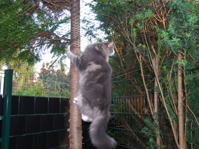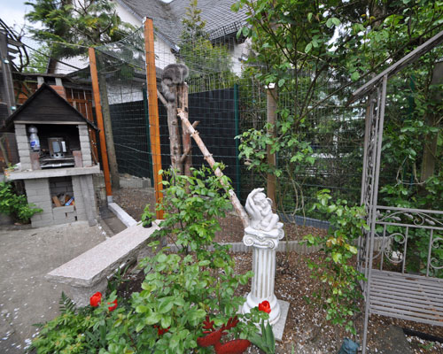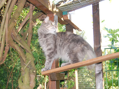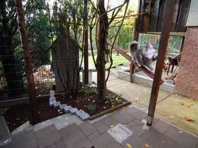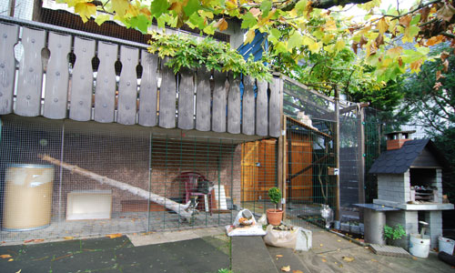 Zum Ende des Sommers 2008 konnten wir endlich unser Gehege in Betrieb nehmen. Zusätzlich zum 12 qm großen gesicherten Balkon kamen nun noch einmal ca. 28 qm Freigehege hinzu. Damit steht nun Freigang über 2 Etagen zur Verfügung.